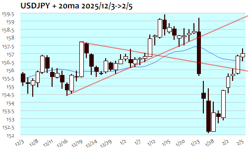 ドル円は+14銭、0.09%高で5日続伸。1月22日(158.42)以来2週間ぶり高値圏で堅調を維持。5日続伸は1月13日以来、1ヵ月ぶりで今年2度め。東京市場の時間帯は156円80銭を挟んでの保ち合いで徐々にレンジを縮小、東京市場終了にかけては下値を切り上げて157円トライへ、欧州時間には157円30銭台まで上昇。これが高値となって一服後、NY市場では米雇用悪化を示唆する指標が続いて軟調推移、安値では156円50銭台まで下落して下げ渋るとNY午後には156円80銭台へと反発、NY終盤には157円回復トライへ。今年高値(159.45)から安値(152.10)の61.8%戻し(156.64)近辺での足場固めを経て76.4%戻し(157.72)トライ継続の様相に。