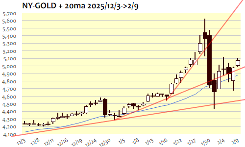 NY金:5,079.4 ドル 2/9(月) ▲99.6(2.00%)