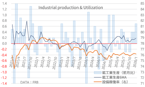 米FRBが発表した1月の鉱工業生産は前月比+0.7%。