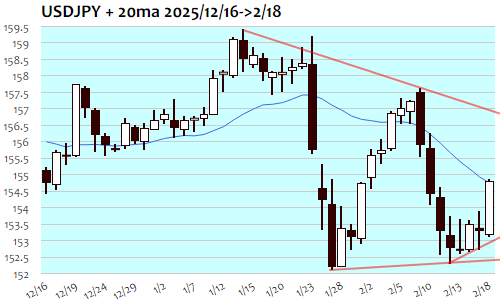 ドル円は+153銭、1.00%の反発で2月9日(155.88)以来、1週間ぶりの高値。日本の1月貿易赤字縮小を受けての小幅円高で東京朝に153円付近の安値をつけて下げ渋り、日本株の上昇にも連れて153円70銭近辺まで反発。一服を挟んで欧州時間には153円80銭台まで一段高、NY朝には高市首相の「責任ある積極財政」発言などをあらためて好感する形で円安圧力が強まり、米経済指標も予想を上回る好結果が続いてドル高の流れとなって154円40銭台へと急騰。NY終盤にかけても堅調推移となって高値では154円80銭台まで上昇。153円60銭の節目を突破して保ち合い上方ブレイク、反発トライへの流れが進行。短期上値目標156円付近まで、もう少しの上昇余地も。