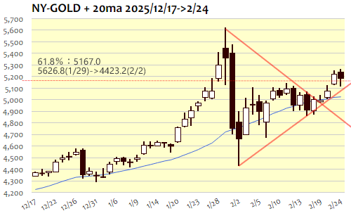 NY金:5,176.3 ドル 2/24(火) ▼49.3(0.94%)