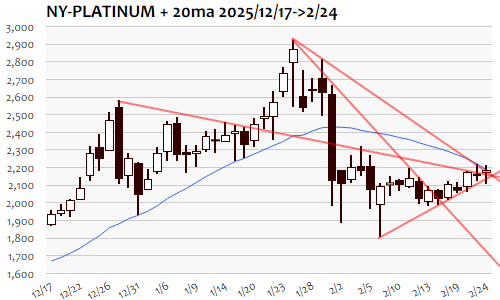 NYプラチナ:2,187.3 ドル 2/24(火) ▲34.7(1.61%)