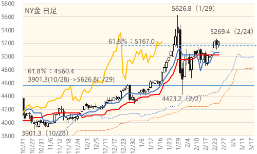 1月29日に5626.8ドルの最高値をつけた後、2月2日には安値で4423.2ドルまで急落したNY金はその後、反発局面を形成して2月24日高値では5269.4ドルまで上昇。