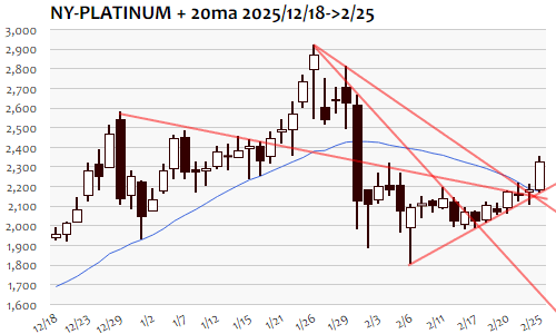 NYプラチナ:2,331.7 ドル 2/25(水) ▲144.4(6.60%)