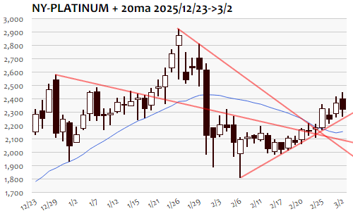 2日のNY金は先週末から+63.7ドル、1.21%の続伸。終値ベースで最高値となった1月29日(5354.8)以来、1ヵ月ぶり高値圏での一段高。週末のイラン情勢悪化を受けて週明け時間外に急騰、5230ドルの節目突破に伴う短期上値目標5380ドル辺りに到達し、5400ドル超えでは一服。しかしイラン側の報復攻撃、ホルムズ海峡封鎖や原油価格高騰などから警戒感も高止まり、ロンドン序盤には5430ドル台の高値をつけ、NY朝にかけても5400ドル台で高止まり。NY市場では有事のドル買いの勢いが強まり、米長期金利も上昇、さらには米2月ISM製造業景況指数の予想外の好結果などもあり、巻き戻しの流れとなって安値では5270ドル台まで下落。それでもNY午後には5340ドル台へと反発。目先、短期上値目標5380ドル近辺再トライ余地も残しながら、5190ドルが当面の下値サポート。これを割り込むようなら5000ドルの大台近辺までを目安に調整へ。