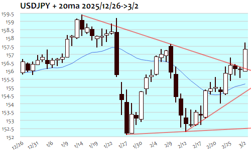 ドル円は+121銭、0.78%の続伸で1月22日(158.42)以来、1ヵ月半ぶりの高値。東京朝に155円90銭近辺の安値をつけて反発すると有事のドル買い優勢の展開へ。156円80銭台まで上昇後には156円10銭台までの下押しも東京市場終了時には157円トライ、157円を挟んでの揉み合いを経てNY朝には米10年債利回り上昇とともにドル買い再開、157円半ばへと水準を切り上げ、ISM製造業景況指数の上振れを受けて157円70銭台まで一段高。NY午後には157円前半へと失速も157円台を維持。結果的に156円40銭の節目突破に伴う短期上値目標157円台前半に到達。目先、短期的には一服感も、年末からここまでの主要レンジ155円から157円近辺までの上限付近に位置し、さらに水準を切り上げるようなら短中期トレンドにも変化の兆しとなり、今年高値159円半ばを超えて160円台へと向かう可能性も。