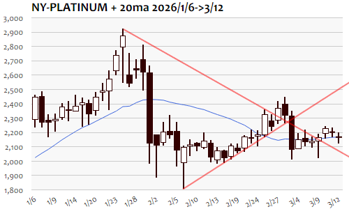 12日のNY金は-53.3ドル、1.03%の続落。続落は2月2日以来、1ヵ月半ぶり。時間外には5130ドルから5190ドル台へと反発も、ロンドン市場でつけた高値は5200ドルに届かず失速。イラン最高指導者モジダバ師のホルムズ海峡閉鎖継続示唆発言などを受けて原油価格が再び急騰したNY市場では、ドル高の流れにも連れる形で急反落。NY引け後には5100ドル割れ、一時5050ドル台の安値をつけて自律反発で5100ドル近辺へ。5100ドルの節目割れを一時的にとどめ、いったんは下げ渋る形に、これを維持できないようだと保ち合い崩れの構図から下値トライへ、4950ドル辺りまでが短期下値目安に。当面の上限5250ドル超へと切り返すことができれば最高値圏再トライへ、5400ドル台を試しに行くような展開にも。