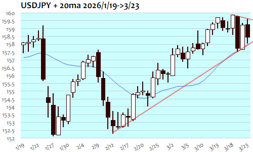 ドル円は-82銭、0.51%の反落。ホルムズ海峡危機に伴う原油高が続き、東京朝には週末高値を超えて159円60銭台まで上昇。しかし介入警戒感などもあって60銭台が上限となり、159円半ばでの小幅保ち合いで午後から欧州時間へ。トランプ大統領の「空爆延期」発言を受けての原油急落に連れ、159円60銭台から158円20銭台まで急落後は自律反発も限定的となり、NY市場では158円半ばを中心に上下動、午後には158円ちょうど付近の安値をつけてNY終盤には158円40銭台へ。159円30銭が目先の上限となり、157円70銭までのレンジで保ち合いを形成、上抜けなら161円台トライへの可能性も、下抜けると156円割れへと調整も。