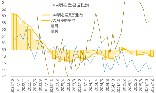 米ISM製造業景況指数は2025年末まで低調のまま。