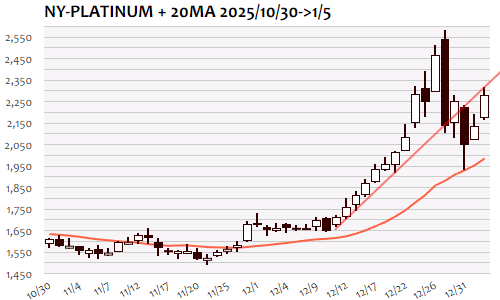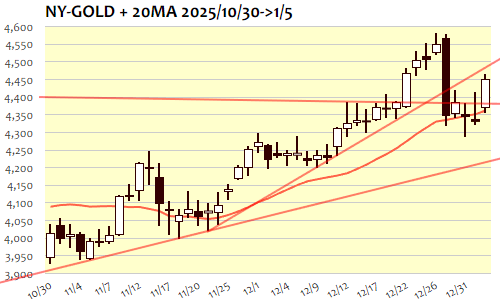 5日のNY金は+121.9ドル、2.82%高で3日ぶりの反発。最高値となった12月26日(4552.7)以来、10日ぶりの高値。結果的に年末年始の調整局面は31日安値4280ドル台でいったん底打ちとなった可能性を残して反発へ。大幅調整からの巻き戻しの流れに米国のベネズエラ介入に伴う安全資産買いの側面も加勢した格好となり、週明け時間外に4360ドル近辺から4450ドル近辺まで急騰、4410ドルまでの下押し後にNY市場では4460ドル近辺へと一段高。高値では4470ドル手前まで上昇し、4390ドルの節目突破に伴う短期上値目標4470ドル程度にほぼ到達。目先、反発も一服となりやすく、4320ドルを当面の下限に高値保ち合いの様相に。