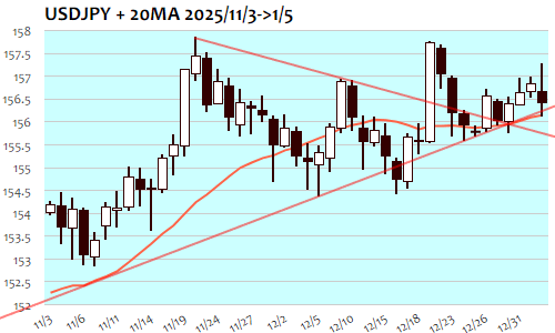 ドル円は-45銭、0.29%安で4日ぶりの反落。12月29日(156.02)以来、1週間ぶりの安値。東京朝には株高にも連れて156円70銭近辺から157円20銭近辺へと急騰、午後には157円30銭近辺まで上昇して失速すると欧州時間には157円割れ。NY朝にかけて156円半ばで下げ渋って反発も157円には届かず、ISM製造業景況指数が予想を下回ったこともあり、戻り売りの流れが加速するとNY終盤には156円10銭台まで下落。156円60銭の節目突破に伴う短期上値目標158円トライには失敗、157円を上限に155円80銭までが目先の主要レンジに。あらためて上抜けできれば158円再トライへ、下方ブレイクなら154円付近までを目安に下値トライへ。
