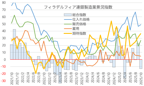 NY連銀とは逆行しがちなフィラデルフィア連銀の製造業景況指数、10月もNY連銀が予想外に好調となったのに対し、フィラデルフィア連銀は予想外に低調。