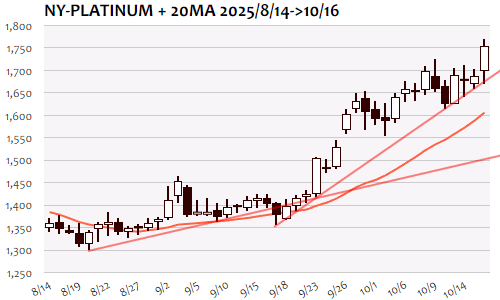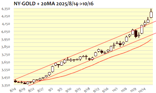 16日のNY金は+103.0ドル、2.45%高で5日続伸。4日連続、10月だけで9回め、今年48回めの最高値更新。前日NY引け後に水準を切り上げた4220ドル台がほぼこの日の安値水準となり、アジア時間には4250ドル台へと一段高。4220ドル近辺までの下押しを挟んでロンドン・NY朝にかけて4260ドルトライ、NY市場では4300ドル台へ、さらに米地銀の信用リスク問題などもあり、リスク回避の流れでNY引け後には4340ドル台へと一段高。10月の絶対値平均騰落値幅は60.2ドル、最大上昇幅は13日の+132.6ドル(3.31%)、最大下落幅は9日の-97.9ドル(2.41%)。17日のアジア時間には4400ドルに向けた流れが進行中、ただしいったん調整となれば4200ドルに向けた巻き戻しも。