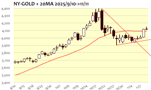 NY金:4,116.3 ドル 11/11(火) ▼5.7(0.14%)