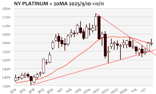 NYプラチナは-2.2ドル、0.14%の小幅安で3日ぶりの反落。前日までの堅調推移の余力で時間外には1600ドル近辺から1620ドル台まで上昇。10月31日(1630.0)以来10日ぶり高値をつけて失速するとNY市場では1580ドル付近まで急反落。上に行って来いとなり、高値と安値をつけて一服後は1600ドルの大台維持をかけた攻防再開へ。引き続き1600ドルが目先、下方向への攻防ラインとなりつつあり、これを維持できれば堅調方向へと向かいやすい状況にも。1620ドルの節目を超えると一段高トライへ、短期上値目標は1700ドルの大台回復。