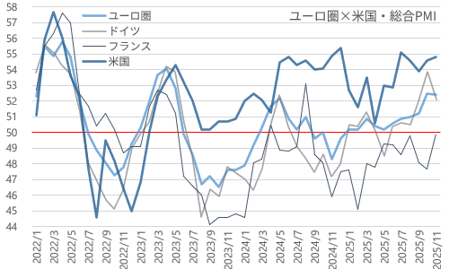 好調のドイツが高水準での急失速、低調なフランスは節目50割れが続くなかでも急反発。独仏逆行状態でユーロ圏はわずかに低下も堅調維持。