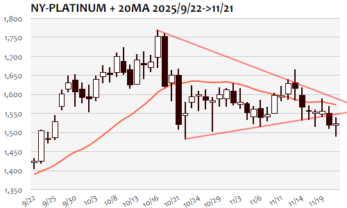 NYプラチナは+7.0ドル、0.46%の反発。アジア時間は1520ドル近辺から軟調推移、前日安値を下回って1500ドルの大台を割れるとロンドン序盤には一時1490ドル割れ。10月22日(1481.2)以来、1ヵ月ぶり安値をつけて切り返すとNY金の反発局面にも追随して1520ドル台を回復。NY午後には1540ドル台までの一段高トライ後に1520ドル近辺へと巻き戻し。十字線を形成して下げ渋るも反発も限定的に、1530ドルの節目割れに伴う短期下値目安1430ドル近辺までを目指す流れは継続へ。