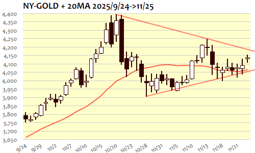 25日のNY金は+45.8ドル、1.12%高で3日続伸。11月13日(4194.5)以来、2週間ぶりの高値。保ち合い上抜けとなった前日の勢いでアジア時間には4130ドル台から4150ドル台へと一段高。一服後の下押しも4100ドル近辺までにとどまり、NY市場では低調な米指標結果を受けてドル安基調となった流れで4150ドル台後半まで上昇。4090ドルの節目突破に伴う短期上値目標4160ドル程度にほぼ到達した状態。短期的には一服感も、次期FRB議長有力候補の報道などもあって利下げ観測が一段と強まりつつあり、月末にかけての指標結果などが追加サポート材料となれば、11月高値圏4200ドル台が意識されるような展開にも。