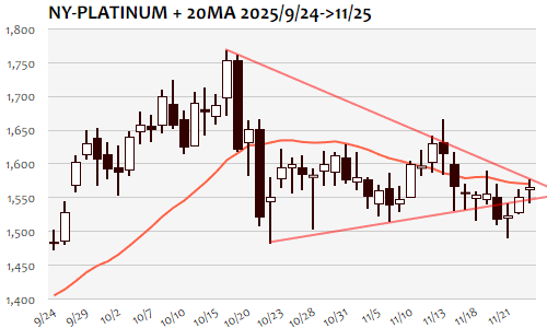 NYプラチナは+13.4ドル、0.86%高で3日続伸。11月13日(1613.9)以来、2週間ぶりの高値。前日までの堅調を維持して時間外には1560ドル近辺から1570ドル台へと一段高、ロンドン序盤には1550ドル近辺までの下押しを挟んでNY朝には1570ドル台後半まで上昇。しかし、ゆるやかに下降する20日移動平均線(1570.4)上抜けも一時的となり、NY午後にはこれがレジスタンスとなる形で1560ドル近辺へと失速。引き続き20日線が反発局面継続に向けた攻防ライン、1510ドルの節目割れへと反落の場合には下値トライ再開で1440ドル近辺までが短期下値目安に。