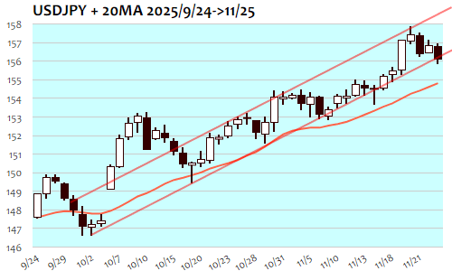 ドル円は-83銭、0.53%の反落で11月18日(155.53)以来、1週間ぶりの安値。日々、上下動を繰り返しながらも上値切り下げの展開に。東京朝の157円手前が高値となって上値を押さえられると156円半ばへと急反落、午後には156円後半での保ち合いとなって下げ渋るも欧州時間には156円10銭台までの一段安。NY市場ではPPIや小売売上高、消費者信頼感指数など軒並み低調な指標結果を受けて利下げ観測再燃とともにドル安基調となって156円割れトライへ、安値となった155円80銭近辺では下げ渋ってNY終盤には156円台を回復。しかし156円30銭の節目割れに伴う短期下値目安155円近辺までの一段安トライへと向かいやすい状況に。反発方向へは157円が当面の上限、突破できれば158円半ばまでを目安に反発トライへも。