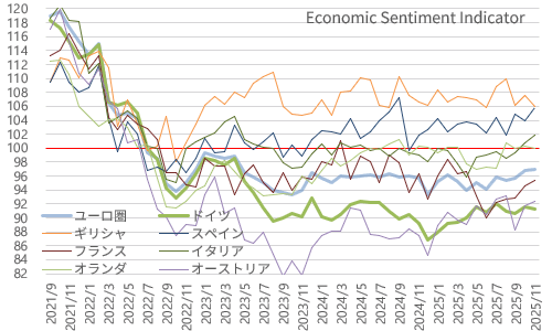 欧州委員会が発表した11月のユーロ圏景況感指数は97.0。市場予想どおりで10月からは+0.2、3ヵ月続伸で2023年4月(98.9)以来、2年7ヵ月ぶりの高水準。