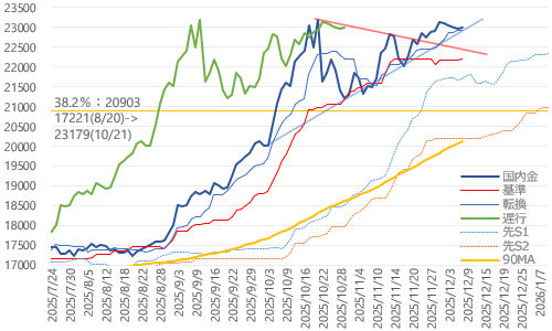 一目均衡表では三役好転を維持。9日間の高値と安値の中央値、転換線(22938)にはなんとかサポートされた格好。転換線を割り込むようだと三角保ち合い下限ラインの延長線も下回る可能性が高まり、短中期堅調局面が崩れ始める形にも。そうなれば最高値更新失敗後の調整局面継続という流れにも。この近辺を維持して最高値更新再トライへと向かえば、三角保合い上抜け後の堅調局面再開へ、11月安値(21310)から11月半ば高値(22834)までの上昇値幅(1524)を急反落後の11月後半安値(22033)を起点に加算した水準、23557円を目指す展開にも。