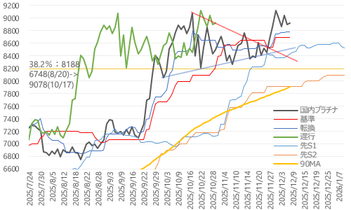 プラチナ価格は+31円、0.35%の反発。堅調推移の9日移動平均線(8866)にもサポートされ、強気のパーフェクトオーダーを維持して最高値圏での保ち合いも維持。9040円超へと保ち合い上抜けなら最高値更新へ、短期上値目標は9200円前後まで。小幅に切り上げた下限8890円を維持できない場合には保ち合い崩れで調整へ、8700円近辺までが短期下値目安に。