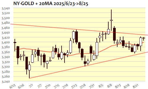 週明け25日のNY金は-1.0ドル、0.03%の小反落。週末の急騰からの一服となり、時間外は3410ドルを挟んでの小幅保ち合いとなり、NY市場では小幅に上昇も週末高値付近、3420ドル台では上値を押さえられ、NY午後には3410ドル台、NY引け後には3410ドル近辺へと失速。この日の変動値幅は16.0ドルにとどまり、今年の平均55.0ドルの3割弱で今年最小。3390ドルの節目突破に伴う短期上値目標3410ドル超に到達した状態での一服となり、3420ドルが目先の上限となって3380ドルまでを主要レンジに保ち合い傾向の展開にも。