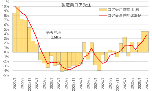 コア受注の前年比では+4.54%となり、6月の+4.53%をわずかに上回って5ヵ月連続のプラス圏、2022年11月(5.38)以来、2年8ヵ月ぶりの大幅増。