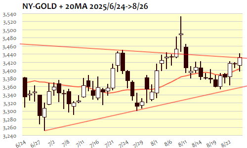 26日のNY金は+15.5ドル、0.45%の反発。終値ベースで最高値となった8月8日(3491.3)以来、半月ぶりの高値。トランプ米大統領によるクックFRB理事解任騒動を受けて買われた格好。アジア時間序盤に3410ドル割れの安値をつけて下げ渋ると、トランプ大統領の発言を受けて3430ドル台へと急反発。一服後は3420ドル近辺での揉み合いとなってロンドン・NY市場へ、NY午後にはトランプ大統領のFRB人事への画策、クック理事は法廷闘争の構えなども伝わり、安全資産買いの勢いも強まってNY引け後には3440ドル台へ。3380ドルを下限に反発の流れは止まらず、3440ドルが目先の上限となるかどうか。