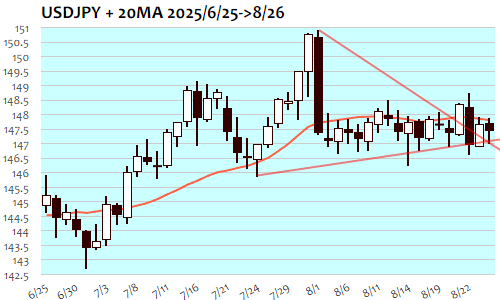 ドル円は-29銭、0.20%の反落。東京朝にはトランプ大統領のクック理事解任発言を受けて147円80銭台から147円近辺まで急落。147円割れで下げ渋ると午後には147円80銭台まで巻き戻し。欧州時間序盤に147円90銭近辺の高値をつけて失速後は147円半ばでの保ち合いに。NY市場では一時147円10銭近辺まで下げながらもNY終盤には147円半ばへ。クックFRB理事は徹底抗戦の構えも、トランプ大統領とFRBとの対立激化の様相はドル売り要因に。しかしドル円の下値も堅そうな状況で保ち合い継続へ。147円80銭へと切り下げた上限を突破できれば上値トライへの可能性、151円近辺までが短期上値目標に。146円90銭の下限を割り込めば下値トライへの可能性、142円半ばまでが下値目安に。