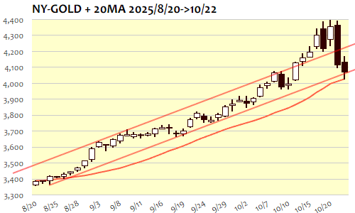 10月20日には一時4400ドルの大台目前まで上昇し、終値でも4359.4ドルの過去最高値をつけたNY金はその翌日には250ドル超、5.7%超の急反落となり、そのまた翌日も40ドル超、1%超の下落となって2日続落。NY金の続落は9月18日以来、1ヵ月ぶり。ほぼ一方的な上昇局面が続いた展開は価格水準を切り上げながら変動値幅も拡大し、乱高下状態となって一服。