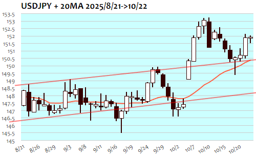 ドル円はわずかに+3銭、0.02%高で4日続伸。10月13日(152.31)以来、10日ぶりの高値水準で上げ渋り、下げ渋り。前日の1円超の大幅高で上昇一服、東京朝に152円付近から151円半ばまでの反動安でこの日の安値をつけた後は151円台後半での保ち合いに。NY市場での高値トライ局面でも152円超では上げ渋り。この日の変動値幅は56銭程にとどまり、今年の平均141銭の4割弱、今年6番めの小動き。利下げ観測に米中対立懸念なども燻り続け、一定のドル安圧力が続く半面、国内では利上げ先送り観測と高市トレードに伴う一定程度の円安圧力も継続。150円半ばから152円半ばまでを主要レンジとする保ち合い継続、上抜けなら153円後半へ、下抜けなら148円半ばへ。