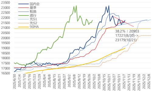 一目均衡表では位置関係が逆転した転換線(21535)と基準線(21591)との揉み合いを経て今朝時点では上抜け。一役逆転から三役好転復活へ。チャート形状も三角保ち合い気味の展開から上抜けの兆しとなり、調整一服後の反発トライがもう一段進行する可能性も示唆。最高値(23179)から10月末安値(21210)の23.6%戻し(21675)を達成し、38.2%戻し(21962)が意識される展開にも。