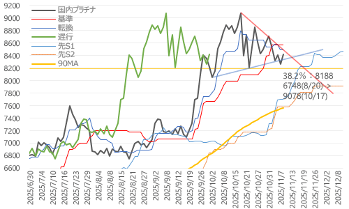 プラチナ価格は+154円、1.86%の反発で11月4日(8551)以来、1週間ぶりの高値。8310円の節目割れに伴う短期下値目安8200円の大台付近トライは失敗、8260円までにとどまって折り返し。軟調局面継続の流れも巻き戻し、今度は8410円超へと節目を上抜けて反発トライ、短期上値目標は8530円程度まで。ただし上下動を繰り返す揉み合い状態が続いて8260円割れへと反落の場合には下値トライ再開へ、短期下値目安は8100円程度まで。