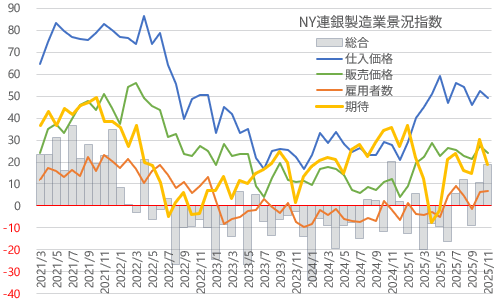 11月のNY連銀製造業景況指数は+18.7。市場予想の+7.6を上回り、前月からは+8.0の続伸で1年ぶりの高水準。上下動の激しいこの指標も2ヵ月連続同じ方向へ、3ヵ月平均では6.90となり、6ヵ月続伸で2022年2月(14.47)以来、3年9ヵ月ぶりの高水準。過去平均6.3を2ヵ月連続で上回り、3ヵ月平均でも上回り、トレンドは明確に上向き。
