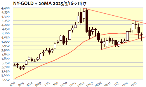 17日のNY金は先週末から-19.7ドル、0.48%安で3日続落。11月7日(4009.8)以来10日ぶり安値圏での軟調推移。週明け時間外序盤の4100ドル台が高値となって上値の重い展開に。ロンドン・NY朝にかけてはゆるやかなドル高基調に連れて上値を切り下げながら下値は4060ドル近辺まで、概ね4070ドル台を中心に保ち合い推移となって下げ渋り。NY引け後には一時4000ドルの大台付近まで急落し、4040ドル近辺へと切り返し。利下げ観測後退に伴う売り圧力と押し目買い圧力との攻防が続く状況で三角保ち合い下抜けをかけた攻防も継続。やや売り優勢の状況が一段と強まり、三角保合いが崩れて3960ドルの節目も割り込むようだと一段安トライへ、3850ドル近辺までが下値目安に。