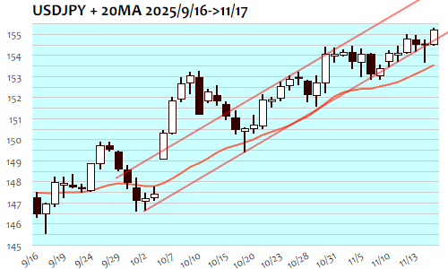 ドル円は+72銭、0.47%の続伸で1月29日(155.25)以来、ほぼ10ヵ月ぶりの高値。週明け東京市場朝に154円40銭台の安値をつけた後は154円後半へとゆるやかに堅調推移。高市政権の「責任ある積極財政」への期待と懐疑の思惑が交錯する状況を象徴するようにゆっくりと円売りが進行。東京市場終了時には154円80銭トライ、ロンドン・NY朝にかけて80銭台へと水準を切り上げるとNY連銀製造業景況指数が予想外に好結果となったことを受けてドル高の流れも加勢、155円の大台を突破するとNY午後には155円30銭台まで上昇。NY終盤にかけても155円20銭近辺を維持。155円の節目を突破したことで上値再トライへ、155円台後半から156円付近までが短期上値目標。下方向へは154円半ばがサポート、割れると152円半ばまでを目安に巻き戻しの展開へ。